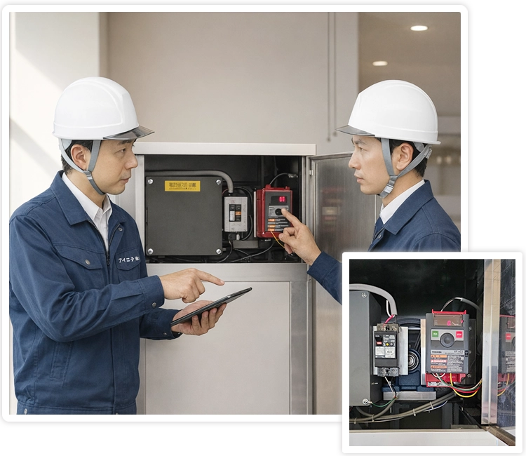 弊社のメンテナンスでは、小荷物専用昇降機の性能と安全性を維持するために、多岐にわたる項目を専門技術者が厳しくチェックします。以下に代表的な点検項目をご紹介します。お客様の機種や設置環境により、点検項目は異なります。